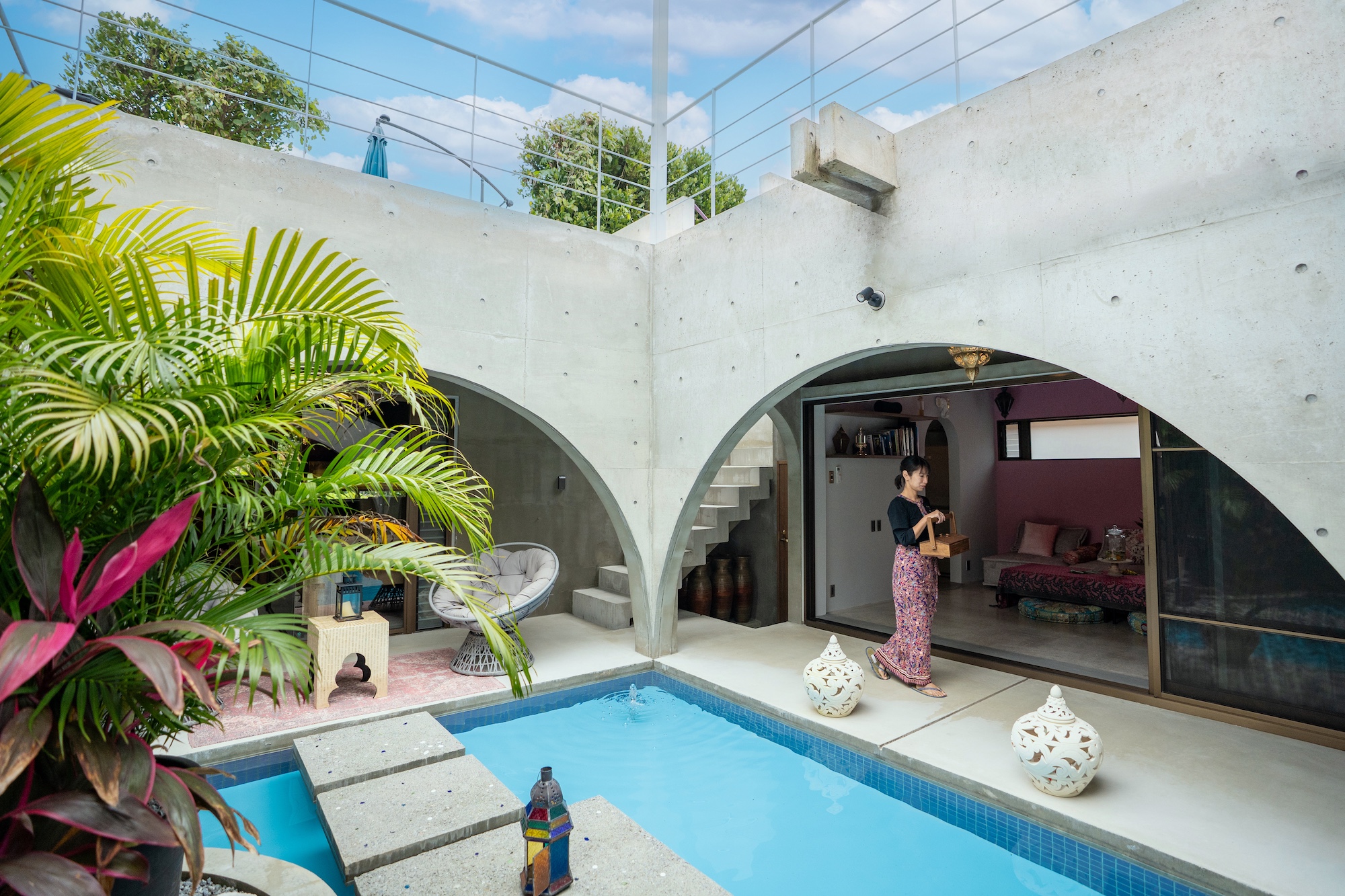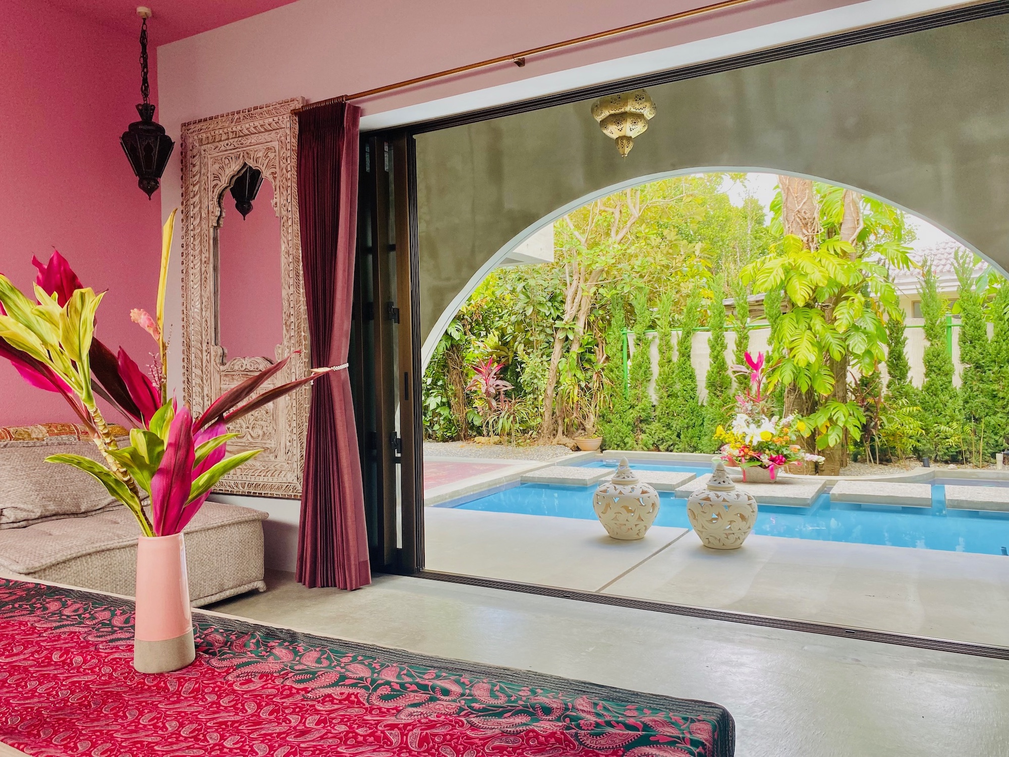 220坪の敷地を贅沢に使ったラグジュアリーな空間。リゾートの設計は古代遺跡のアンコールワットなどにも使われたスターパティアヴェーダ建築という「健康になるために考えられた古代の建築デザイン」を採用。例えば寝室では、入眠・熟睡しやすい部屋の形や色を使用するなど、ゲストの心と身体を癒す工夫を散りばめています。